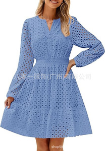 2024欧米の外国貿易クロスボーダー婦人服アマゾンの起爆vネックの透かし彫りの穴の刺繍綿の長袖のワンピース