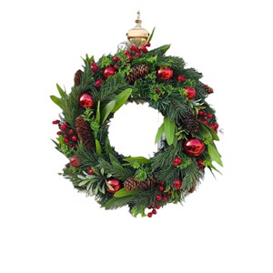 国境を越えた新しいクリスマスリース、赤い冬のベリー、模造松ぼっくり、赤いボール、玄関飾り、卸売ギフト