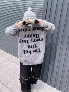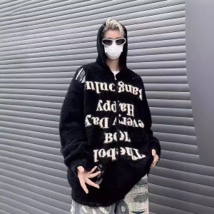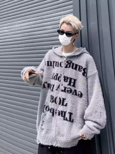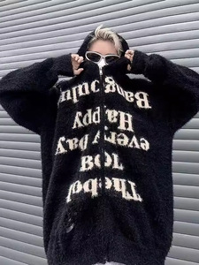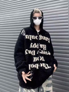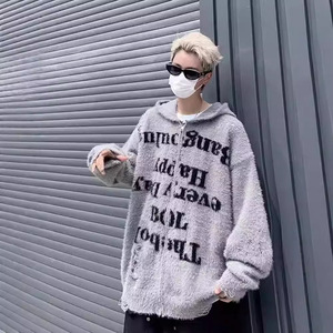水貂绒毛衣男连帽冬季加厚破洞针织衫秋冬款美式高街潮牌拉链外套