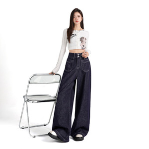 色褪せ防止の丹寧原色の超柔らかい垂れ下がった感じの高い腰の双ボタンのデニムのワイドレギンスのズボンは簡単で、女性に合わせて痩せているワイドレギンスのズボンを見せます。