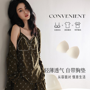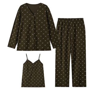 【7A抗菌】胸パッド付き純綿パジャマ レディース 春秋 長袖カーディガン 純粋な魅力のサスペンダー3点セット ホームウェア