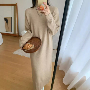 韓国系のシンプルな雰囲気の長いタイプのコートのメリヤスの底のワンピースの女性のゆったりしている怠惰な中に高襟のセーターのワンピースを掛けます。