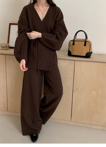 2025秋冬新作レースアップセーターセット女性用クロスボーダーゆったりスタイルニットカーディガンワイドパンツツーピースセット