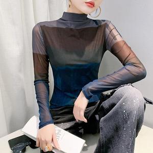 欧品欧品女装2024秋冬ファッション洋気長袖高襟ネット糸tシャツ女性定位花上着実写
