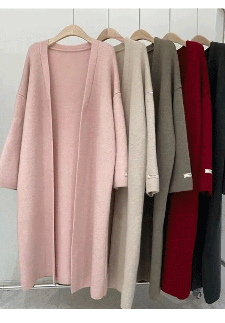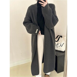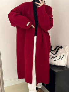 韓国系秋冬女性は、長いvネックの袖を厚くしてピンクの高級感のあるコートのコートを着て、ゆったりとした怠惰なニットカーディガンを着ています。