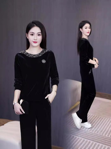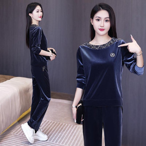 ファッショナブルなゴールドベルベットカジュアルスーツ女性のための秋 2025 新しいルーズスリムストレートワイドレッグパンツ 2 点セット