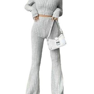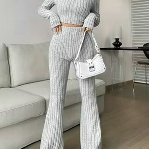 ファッションの純色のリブの2つのセットのファスナーの長袖の短い上着と腰の高いラッパのズボンのスーツの女性のレジャー