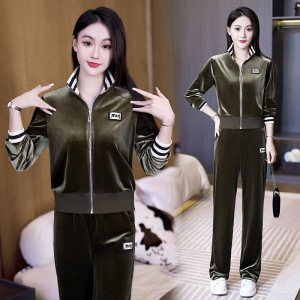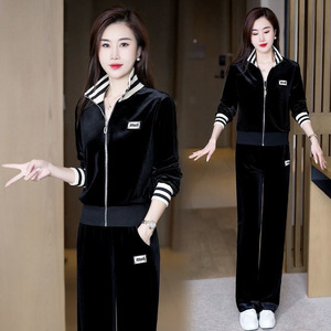 高級金糸ベルベットスポーツスーツ レディース 2025春秋新作 おしゃれで若々しいジャケットとワイドパンツのツーピースセット
