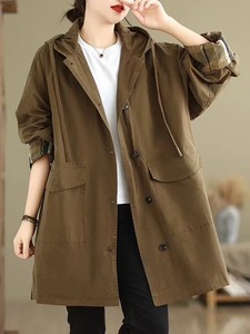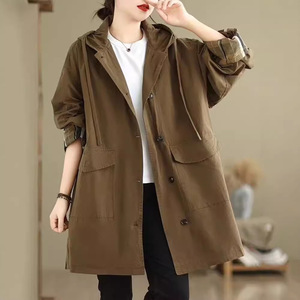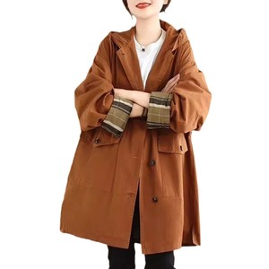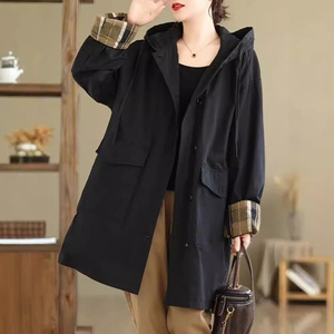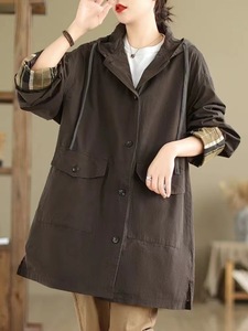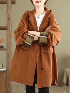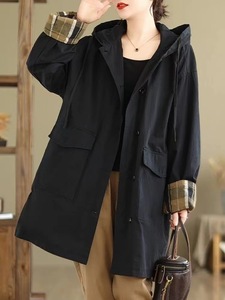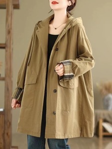 秋の新作、アーティスティックでカジュアルなミドル丈のトレンチコート、レディースワークウェア風、パッチワーク、フード付き、ゆったりとしたおしゃれで万能なジャケット、卸売