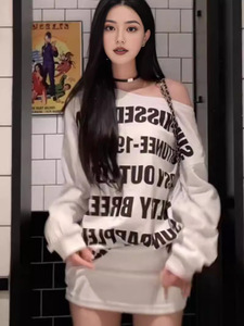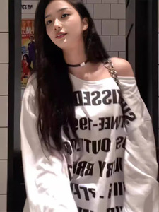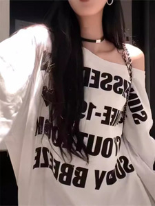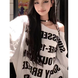 アメリカのギャルの斜め肩のアルファベットのプリントの長袖のtシャツの女性の早秋の中で長いタイプのカジュアルでゆったりしています。