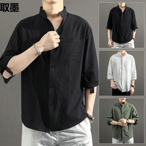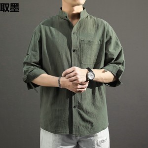 2023夏の七分袖亜麻シャツ男性日系カジュアルゆるい立襟綿麻シャツトレンド男性