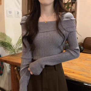 一字の肩のニットの底のシャツの女性の春と秋冬の不規則な中にフランス式の高腰の正肩の鎖骨の長袖の上着を掛けます。