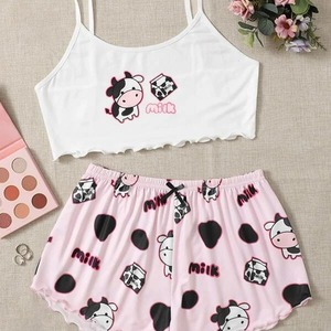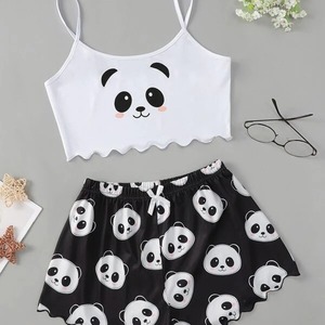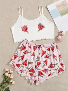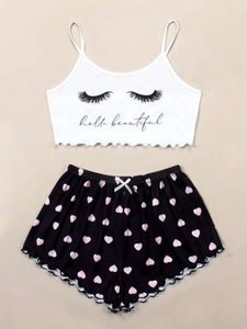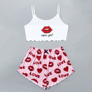 国境を越えた特別な現物ニットベストのストラップの異なる模様のプリントが快適で薄い女性の在宅パジャマセット