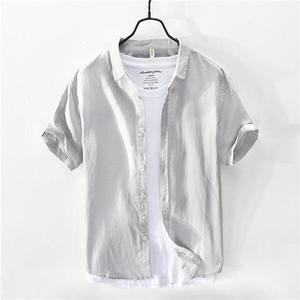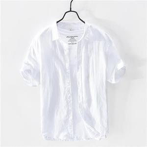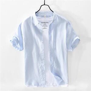 夏の薄い氷糸亜麻シャツ男性半袖ゆるいビジネスカジュアル純色半袖綿麻シャツ白潮