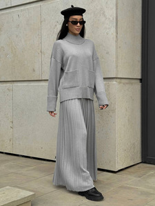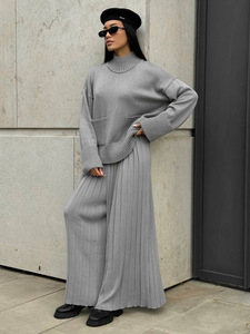 フランス風の気質の優雅な高襟のニットのスーツの女性のファッションの高級な婦人服のしわのゆったりしているカジュアルなズボンの2つのセット