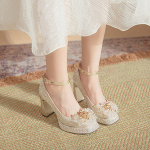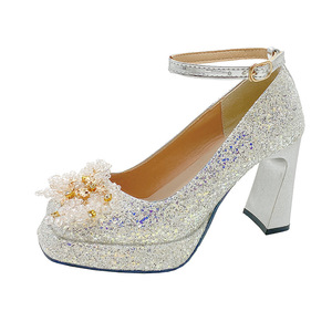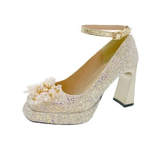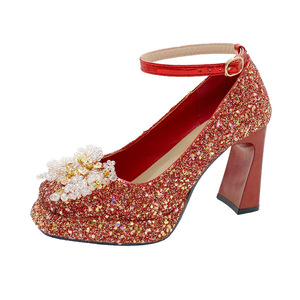 きらきらと光る赤い結婚靴の女性2025の新型の一字のボタンは珠の花を持っています。