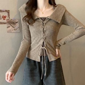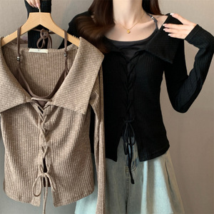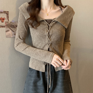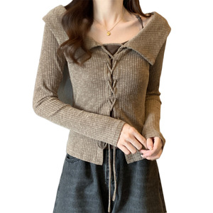 24大サイズの太ったMM早秋の新しいレトロなギャルの偽の2つのひもは首の大きい襟の長袖の上着の女性を掛けます。