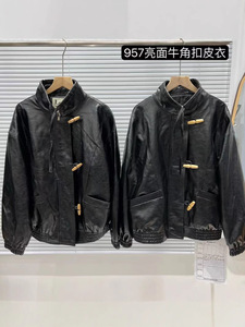 北欧酷女孩牛角扣黑色立领皮衣 廓形帅气复古夹克外套源头厂家