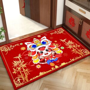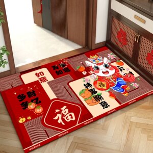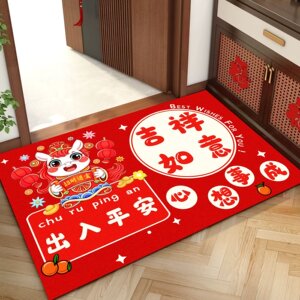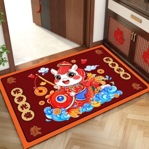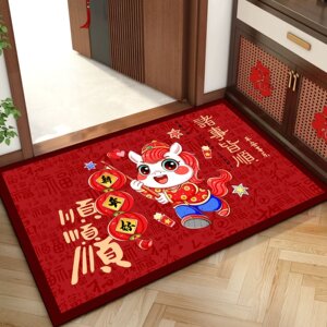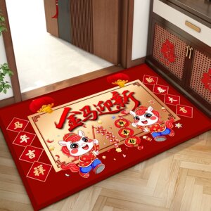 2026年漫画風馬年おめでたい意味入り玄関マット 家庭用玄関カーペット 新年赤いお祝い足元マット