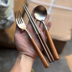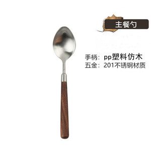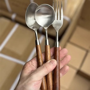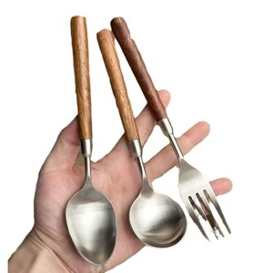 ステンレスの木の柄の食器の洋食ナイフの高級感は胡桃の木のスプーンをまねてスープを飲んでステーキのフォークのセットを食べます。