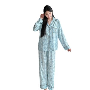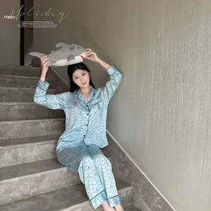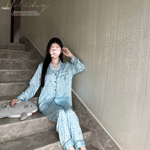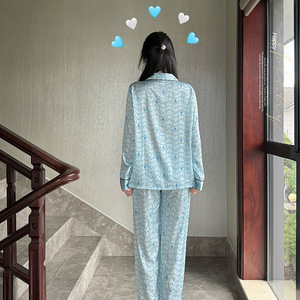 【刺繍愛】春と秋の新型女性可愛い氷の薄いパジャマ長袖シルクの家庭服セット