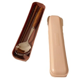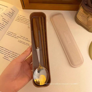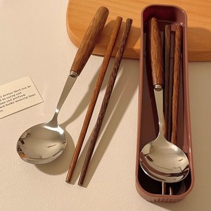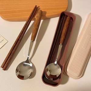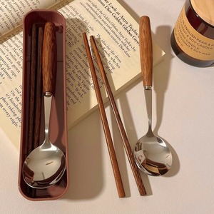 キャラメル色の手羽木 ~ レトロ高級感箸スプーン木柄学生は外出して携帯食器セットを持っています。