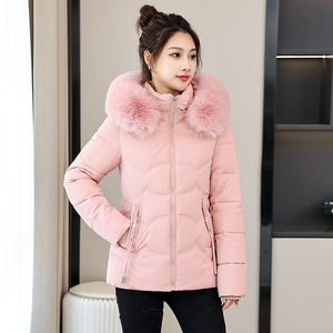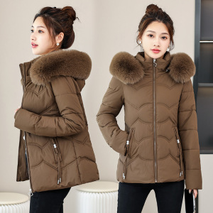 女性用ショートコットンコート 2025 新しいスタイルの小柄なファッショナブルなウエスト二重ライン大きなファー襟防風袖コットンコート