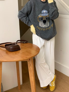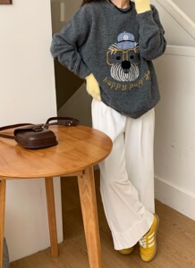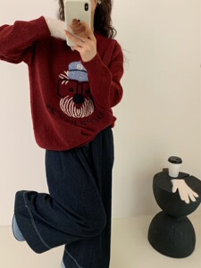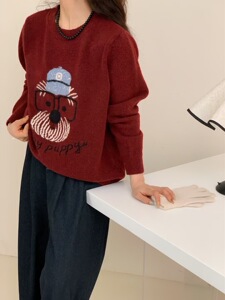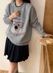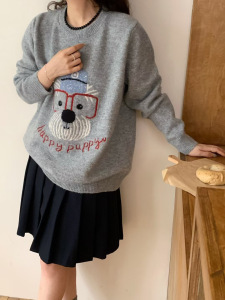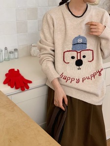 韓国系のシンプルな漫画の子犬の刺繍のプルオーバーのセーターの女性の秋冬の新型のゆったりしている怠惰な風のカジュアルなニットの上着