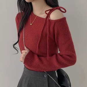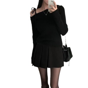 秋の小衆のレトロな中に、底のシャツの上着の斜めの襟の肩の結び目を着て、スリムな長袖のニットのセーターの女性を見せます。