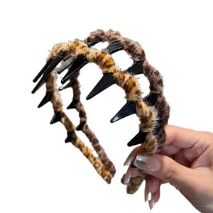 韓国系ミンクのぬいぐるみの髪はヒョウの紋様のカチューシャの女性の髪を整理します。