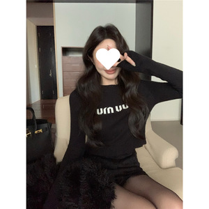 字母提花灰色毛衣女秋冬新款短款针织打底衫长袖圆领套头内搭上衣