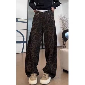 アメリカのレトロなヒョウ柄のジーパンの女性の秋冬の新型の大きいサイズのナシの形の体つきはゆったりとしていて痩せています。