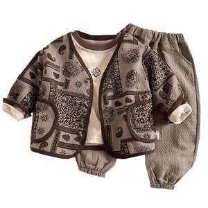 赤ちゃんの長袖の秋の服のスーツの男の子の子供の春秋の金の洋風のコートの秋の薄い茶色の復古の3つのセットの卸売り