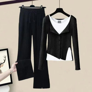 新商品の婦人服スーツ春と秋の灰色の偽の2つの上着の底のシャツのオープンフォークの広い足のカジュアルなズボンの3つのセットの女性