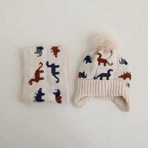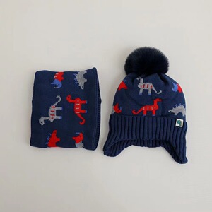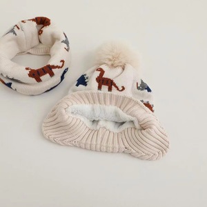 越境児童帽子マフラーセット冬ベルベット保温赤ちゃん乳幼児マフラー恐竜ニット毛糸帽子