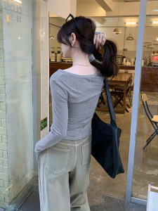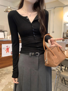 レトロな紺色の半開襟長袖tシャツの女性の秋の気質の修身の底のシャツの頭の上着