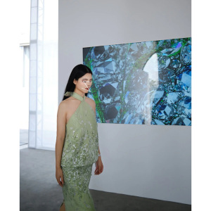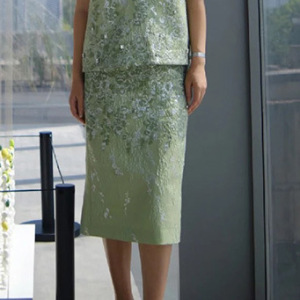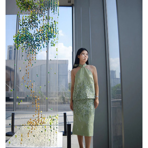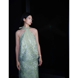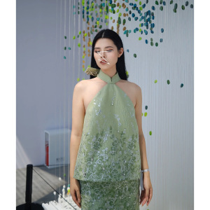 新中式国风挂脖提花露背蝴蝶结订钻宽松上衣直筒中长改良旗袍套装