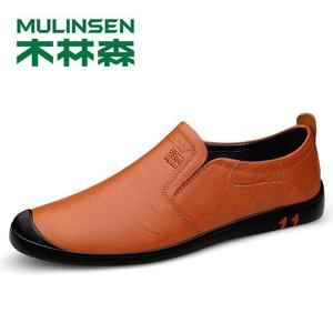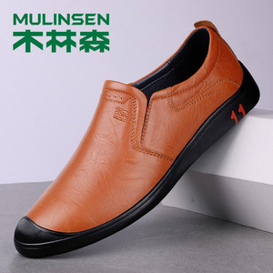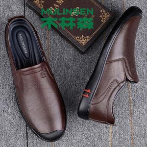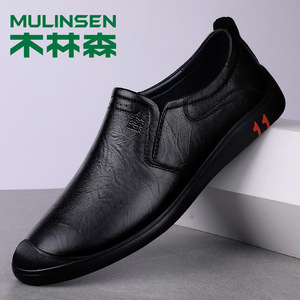 木林森男靴秋の新型の頭層牛革の柔らかい底のカジュアルな靴の本革の通気性の1足の豆の靴の男
