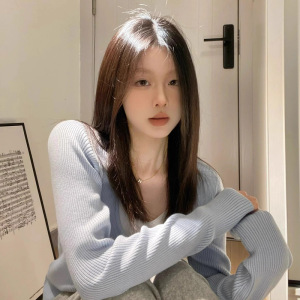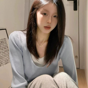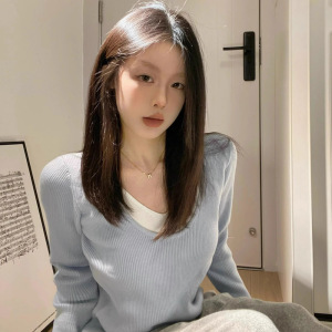 偽の青いvネック長袖ニット女性秋冬春の薄いタイプのインナーシャツのセーターのニット上着