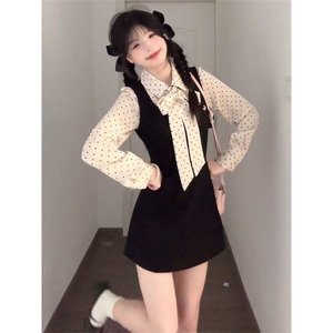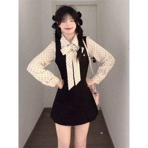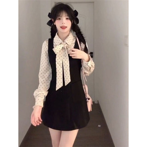 日本系の甘くて清新な刺繍の腕のベストのワンピースの女子学生の蝶結びの波の点のシャツの2つのセットの服
