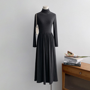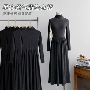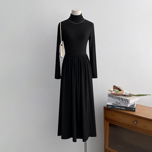 2025年 ハーフハイネックニット長袖ワンピース レディース ベーシックロングワンピース 初秋 ヘップバーン風ワンピース 春秋インナー