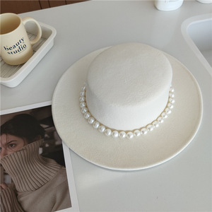レトロな新しいパールフレンチウールハット大きなつば付き秋冬セレブヘップバーンブラック英国帽子フラットトップ