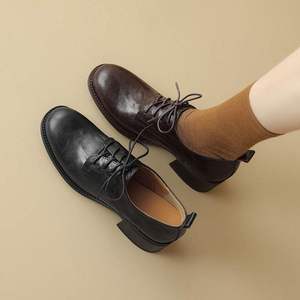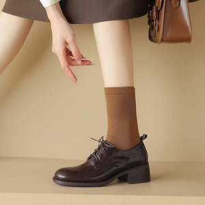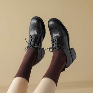 フランス式通勤小羊皮深口単靴丸首太とハイヒールの英倫風系帯小革靴女2024年