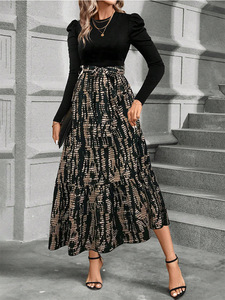 アマゾン越境EC独立サイト、AliExpressの新作、配色ハイウエスト花柄プリントワンピース、女性用、エレガント