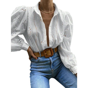 2024秋の新商品の通気性が優雅な透かし彫りのプリントのデザインの質感感の灯籠の袖の微透の長袖のシャツの女性