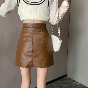 大きいサイズのカレー色の小さい皮のスカートの秋の2024年の半身のスカートの高腰のpu皮の短いスカートのしわはフォークのスカートの女性を開きます。