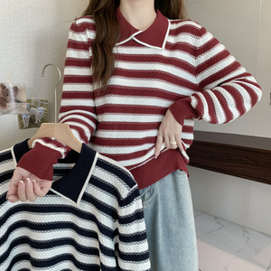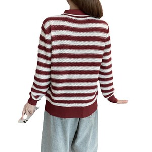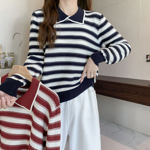 実拍2024秋冬の襟のストライプの女性はやせている底のシャツの女性の長袖のセーターを現します。