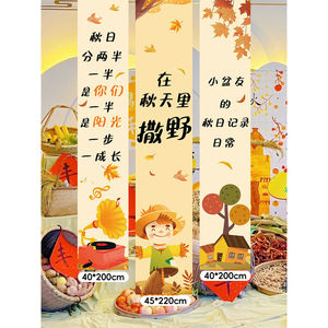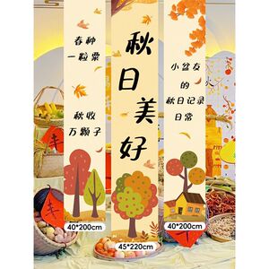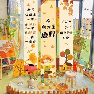 秋の幼稚園は秋の環を干して豊作のテーマの雰囲気を作ります。