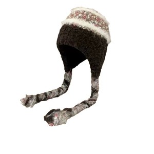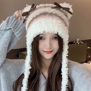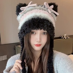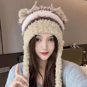 韩版新款可爱拼色条纹字母贴标毛绒护耳帽保暖百搭可当包包雷锋帽