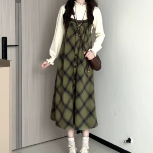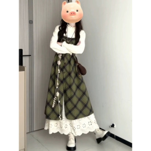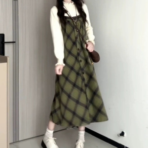 森系の甘い気質のレトロな緑色の格子縞のワンピースは女子学生の秋冬の清新な底をつけます。